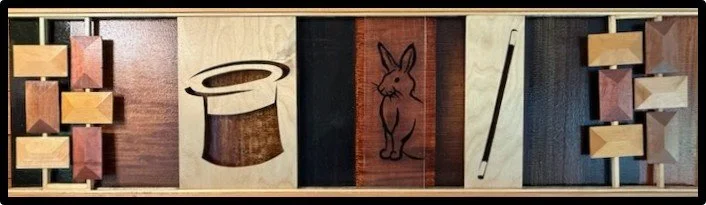 This artwork was made for my dear friend Lisa, featuring motifs of the magician: top hat, rabbit, and a magic wand. The panels are moveable along tracks, to customize the design.