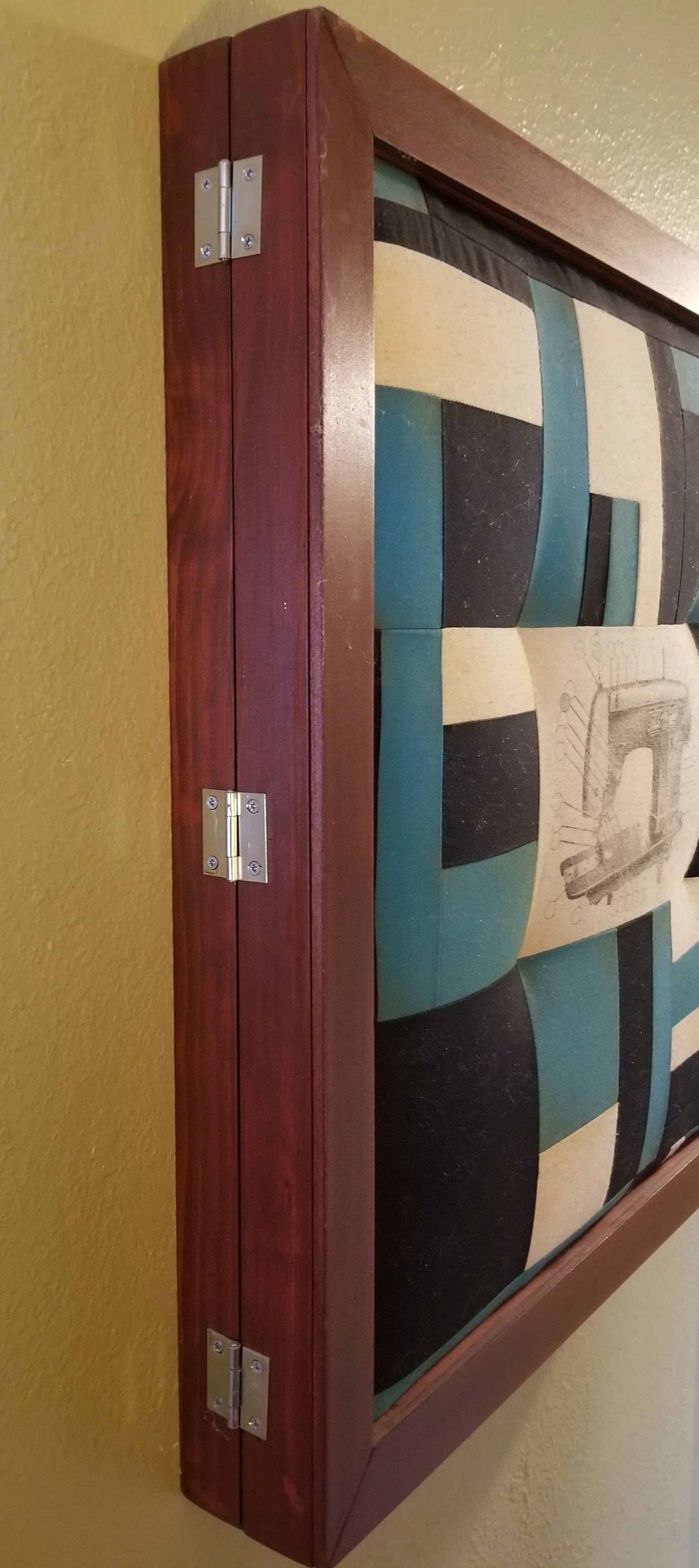 This artwork opens to reveal an interior homage to my vintage sewing machine, which has more style than most. Is your needle thread tension too weak? Turn that knob.