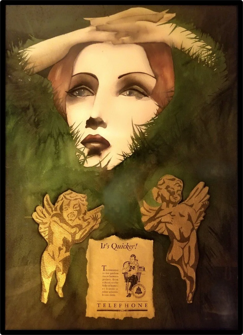 Image taken from Josef von Sternberg’s 1932 film ‘Shanghai Express’, starring Marlene Dietrich. Here she's joined by golden cherubs and a vintage advertisement promoting the convenience of using the telephone.